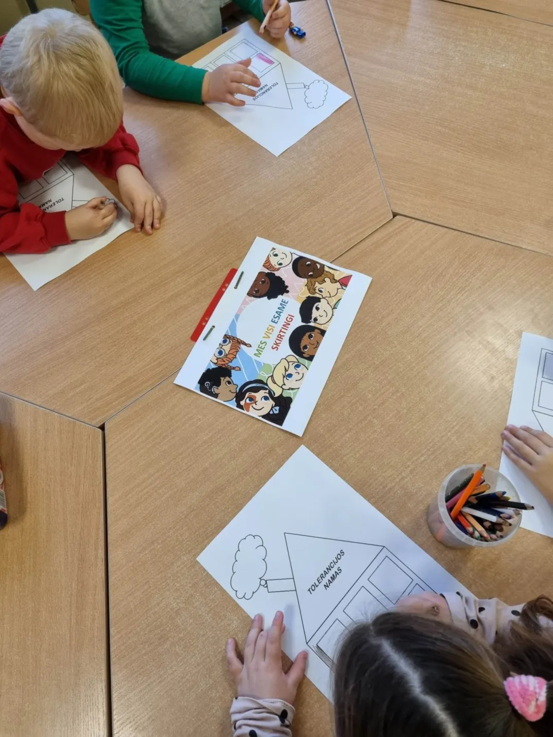 Su vaikais buvo kalbama apie toleranciją, pagarbą, bendrystę ir sugyvenimą kartu. Aptarėme, jog kiekvienas mes esame skirtingi, tačiau meilės reikia kiekvienam. Atlikdami kūrybinį darbelį „Tolerancijos namas“, vaikai dalijosi mintimis, diskutavo, kaip jie supranta pakantumą, kantrybę, meilę, kilnų elgesį, švelnumą. Negailėjo vieni kitiems šiltų, gražių žodžių.